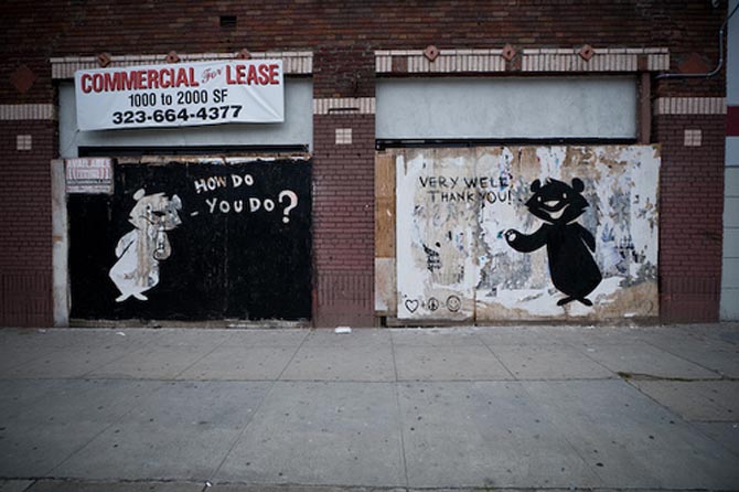 Determined to find out who is responsible for these bears, I went on a cyber quest to track down the artist responsible for these beacons of civility in the concrete jungle. My quest led me to an unassuming gallery in Echo Park and a popular mural in Downtown Los Angeles…In my next post I’ll formally introduce you to the artist behind some awesome bears.