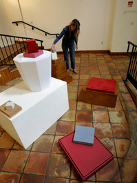 “The Arrangement” attempts to turn the process of an installation inside out and focuses on the behind the scenes elements of an exhibition. Visitors are encouraged to interact with blocks, pedestals, hooks, braces, lucite boxes and other tools to re-arrange the space. Photographs are taken of the visitor’s artistic expression and displayed on the walls within the studio.