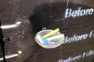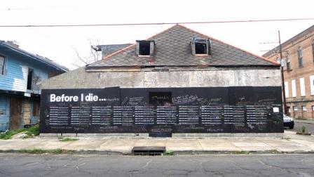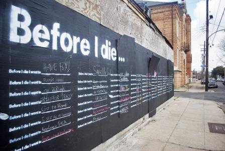 During my ride we passed a boarded up house with one side painted in black chalkboard paint. At the top of the black plywood wall a large, white, spray painted stencil says “Before I Die…”. Underneath, smaller versions of this proclamation are repeated numerous times with blank lines after each statement. Hung along the black wall were wire dishes containing large, brightly colored pieces of chalk; people are invited to share their answers to this question.