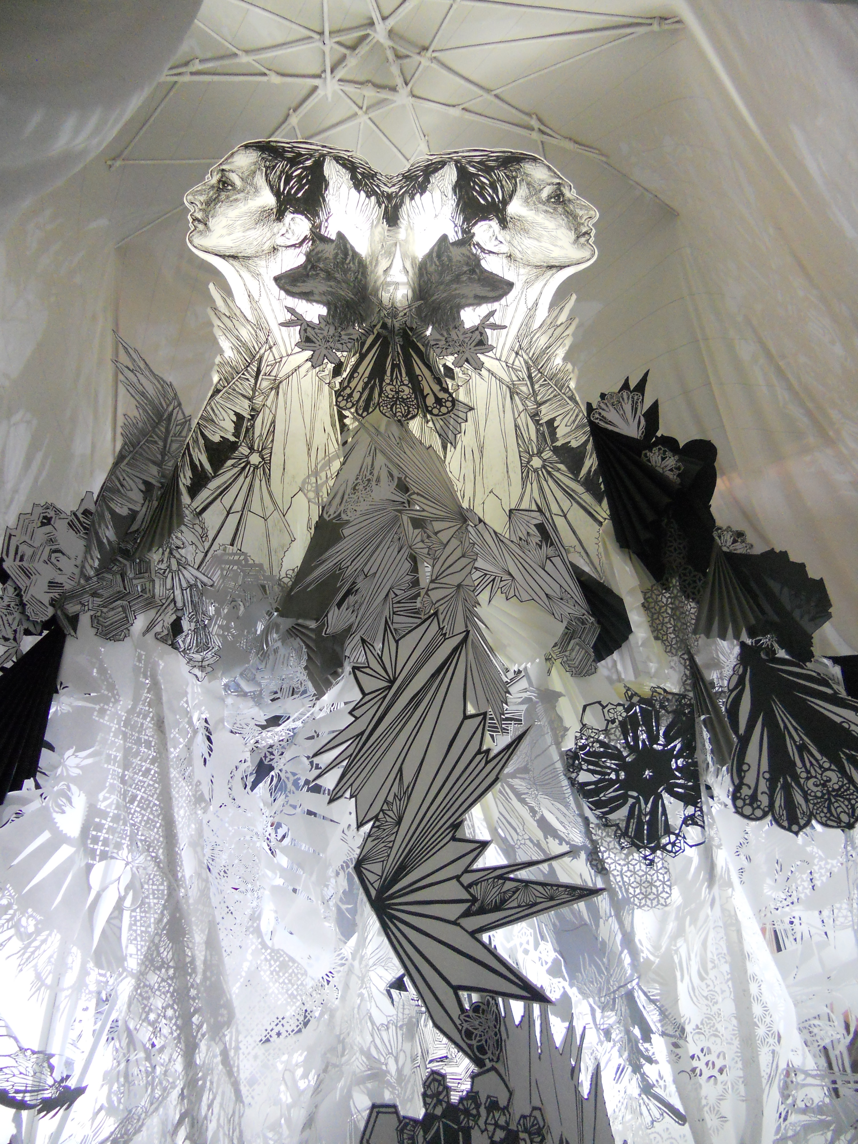 The underlying theme to the exhibition is the strength of community formed through art, music, dance and fashion. Wild Style takes center stage, with a wide array of artists descending from Wild Style’s lineage. N.Y. in the 1970’s saw a convergence of hip hop and punk which is also highlighted in some of the galleries in the exhibit. A diversity of mediums are represented from writing and skate board art to stencils and paper cutting. An ambitious and truly breathtaking piece can be found in a tented piece by N.Y. artist Swoon. The installation took over one month to create and is truly one of the most beautiful pieces of art I’ve seen.