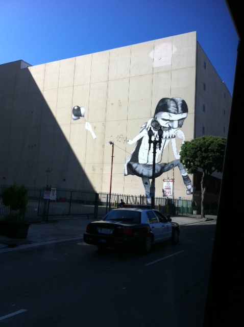 7/22/11 UPDATE The mural is by Os Gemeos, twin brother graff artists who hail from Brazil. Thanks to Hairpik for the positive ID! If you are in L.A. and want to see more Os Gemeos, be sure to check out Art in the Streets at MOCA’s Geffen Contemporary. The exhibit wraps on 8/8/2011.