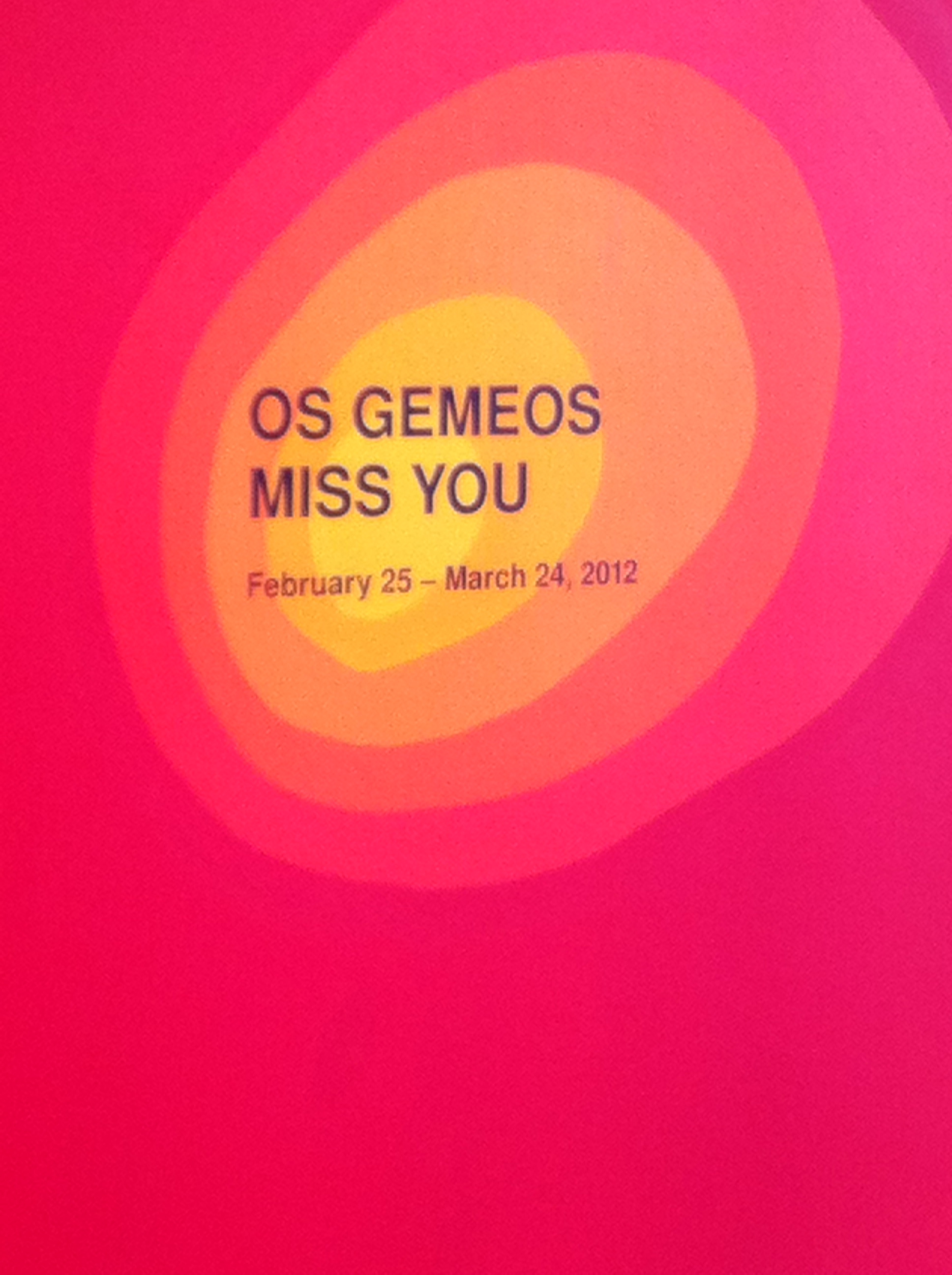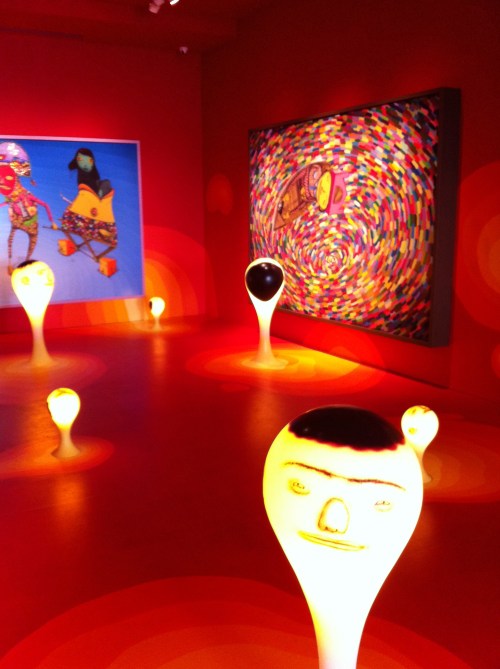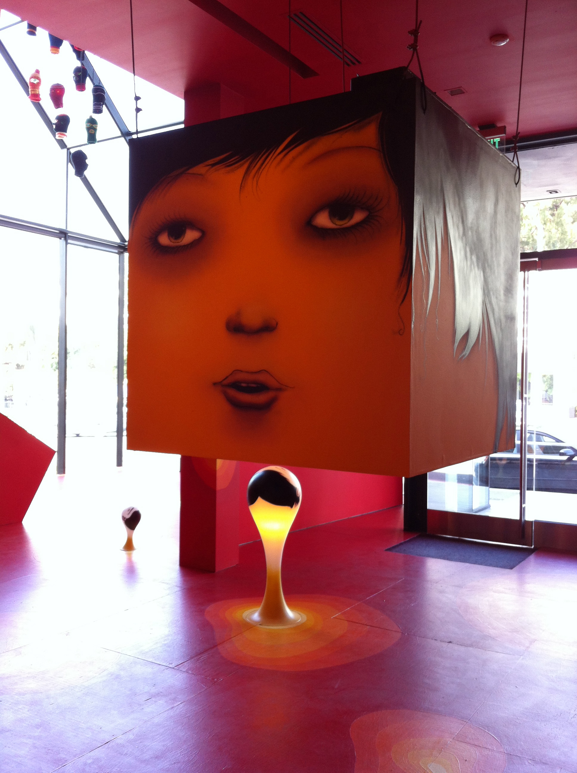 Number 1 on my must see list of shows for 2012 2as Os Gemeos’ “Miss You” at Prism Gallery. Saturday was its last day and I finally made it in to see their work. I loved how the gallery was transformed into the mythical world found in their paintings. The walls and floor were painted in gradient shades of crimson and orange to look like fresh lava. Emerging from the lava floor were these glowing primordial globes painted to look like heads struggling to ascend to the ceiling.