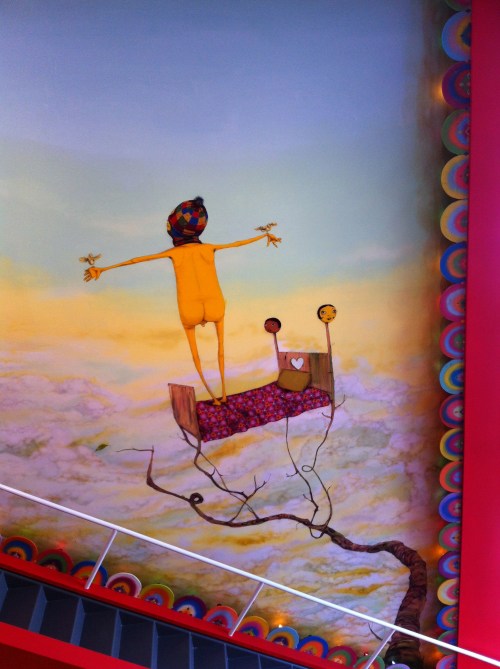 At times the pieces appear to be deeply personal. There was a beautiful mural painted on the wall near the stairs of the gallery. Looking out on it from the second floor, it reminded me of Rio de Janeiro’s iconic art deco statue of Christ the Redeemer sitting at the peak of Corcovado hill.