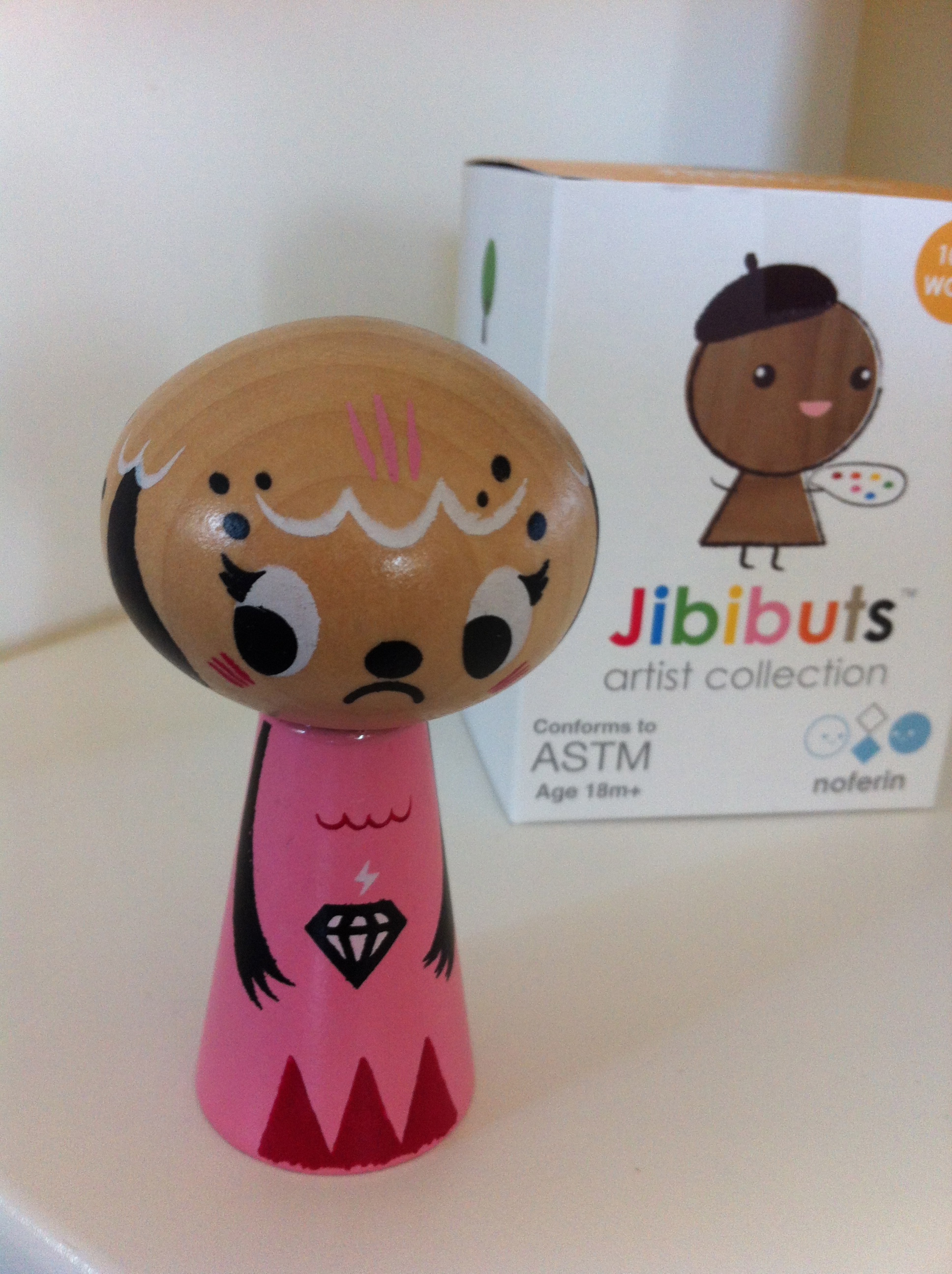 I rarely speak of collectibles, but for those of you collectible neophytes out there, a blind box item is a play on a Japanese Gashapon toy. Think of it as a designer, adult version of the capsule toys you used to get out of a vending machine. Twelve featured artists all contributed a uniquely designed, painted wooden piece that looks like a modern kokeshi doll. You don’t know which artist you are going to get until you open the box. Since I recognized a number of the artists featured, I had to buy one, and I ended up getting Squink’s design.