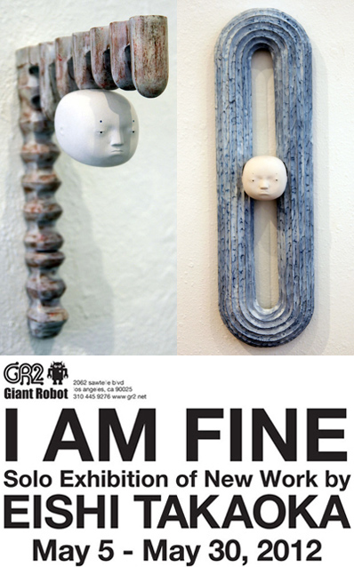 A half a block down Sawtelle, we also stopped by “I am Fine” — Eishi Takaoka’s solo exhibition at Giant Robot 2’s gallery across the street from the store. His work was quite stunning in that it features carved wooden heads all sharing the same morose expression, yet each are adorned in a variety of backdrops, halos and other refinery that lend a unique story to each piece.