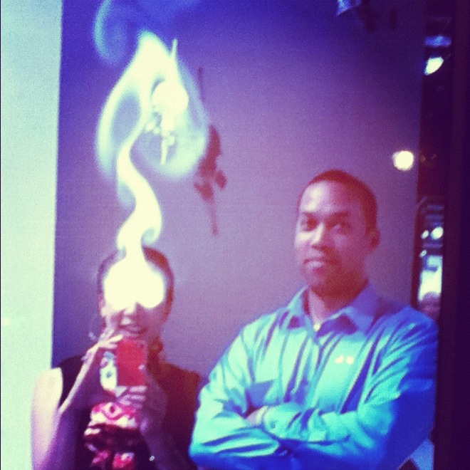 The Bitforms booth was a technological playground, and even I got caught up in Rafael Lozano-Hemmer’s shadow box display called “The Year’s Midnight”. The piece is made to look like a mirror where the viewers image is displayed on a screen and a computerized sensor tracking system zeroes in on the eyes and then displays plumes of smoke emerging from the eye sockets. I generally don’t like taking pictures *with* art, but I couldn’t help myself with this one.