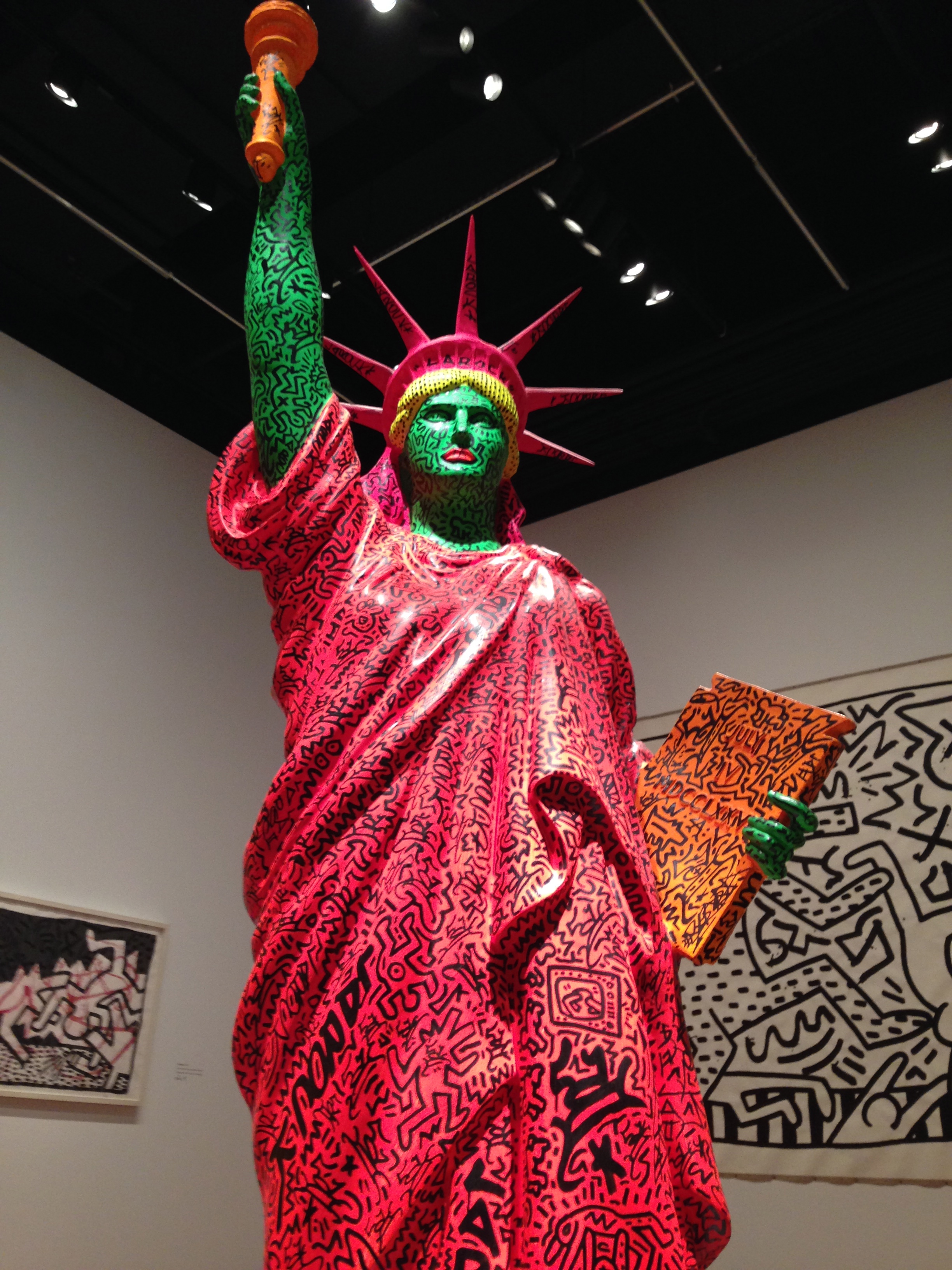 In the weeks following my visit to the show I have been reflecting on how art has played a prominent role in crystallizing the emotions circling our current tragedies. Whether it is the distrust and unrest around the U.S. militarized police complex in Ferguson, Mo, the horrific assassinations in Paris, or the tragic, massive bloodshed taking place in Nigeria, artists have played a cathartic role in articulating emotions that are often too difficult to put into words. In this way, Haring’s artistic eye acted as a mirror into the cultural zeitgeist of the time. I was most struck by the elaborate totems and large-scale installations depicting wealth, power and control. One standout piece was “the Great White Way, 1888”.